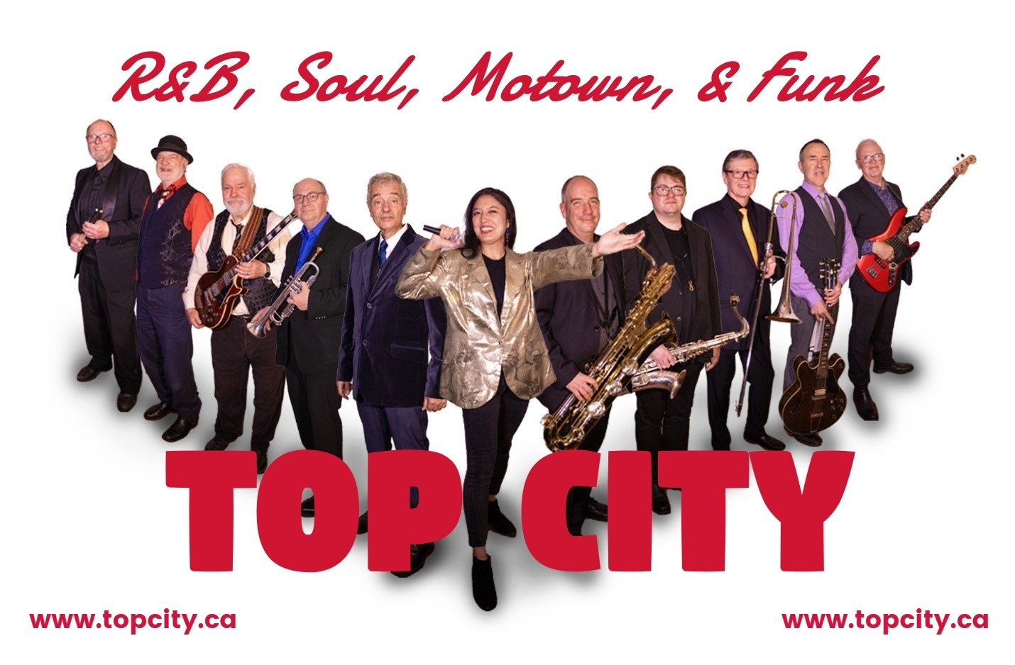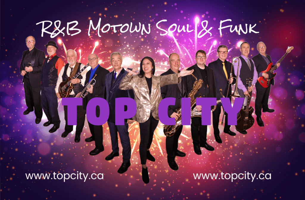 A favorite of Special Event and Festival goers for over three decades, the 11 Piece R&B Band TOP CITY performs your favourite R&B, Soul, Motown, Funk, and more. We feature well-known songs by legendary R&B artists, like James Brown, Aretha Franklin & Stevie Wonder etc., and the iconic sounds of the “Great Horn Bands”. Think – Chicago, Tower of Power, Earth Wind and Fire, Powder Blues, and more!
